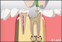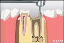 1° Le chirurgien-dentiste va donc procéder à la dévitalisation* de la dent ; en clair il va extirper de la partie centrale de la dent avec les instruments adéquats, soit manuellement soit mécaniquement, la pulpe dentaire constituée de filets nerveux et de très fins vaisseaux sanguins. Cette étape permet d’enlever la totalité des tissus nécrosés ou infectés et de procéder à un nettoyage soigneux anti bactérien.